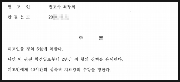 재판부는 강제추행 범행이 명확하고 피해자와의 합의가 이루어지지 못 했다는 점을 들어 징역 6월을 선고하였으나, 의뢰인이 초범이고 진심으로 반성하는 태도를 보이며 피해회복을 위해 노력한 점을 들어 집행유예 판결을 내렸습니다.
