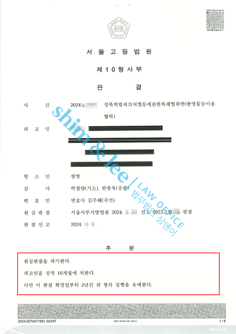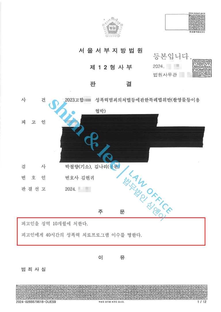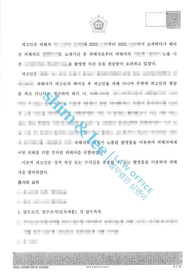 - 의뢰인님은 촬영물이 더 유포되지만 않았으면 하는 마음으로 찾아주셨었는데, 가해자에 대한 유죄 판결과 높은 합의금으로 마음의 위로를 조금이나마 받을 수 있어 기뻐하셨고, 심앤이에 감사하다는 말씀을 거듭해 주셨습니다.
