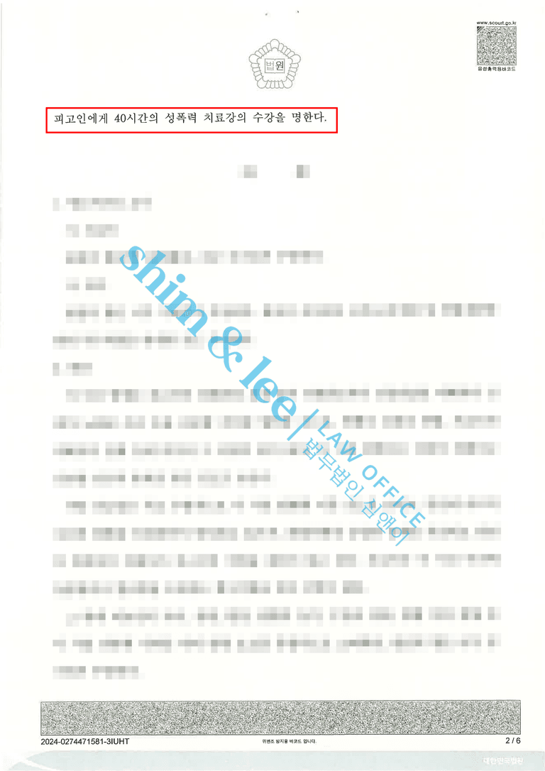 - 최종적으로 가해자에게는 합의를 진행했음에도 불구하고 최종적으로 징역 10개월, 집행유예 2년, 40시간의 성폭력 치료강의 수강 명령이 내려졌습니다.