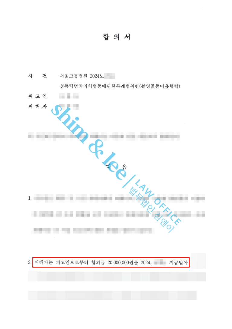 -이후 진행된 2심에서 대표 변호사님은 같은 직장에 다니고 있는 의뢰인님을 고려해 합의서 조항에 ‘접근금지’와 ‘접근금지의 범위’를 구체적으로 적어 넣었습니다. 또한 의뢰인 보호를 위하여 비밀유지와 통신제한, 2차 가해 및 보복 금지 등 구체적인 조건들을 넣어 작성하였고 총 2천만 원이라는 합의금으로 합의를 진행하게 됩니다.