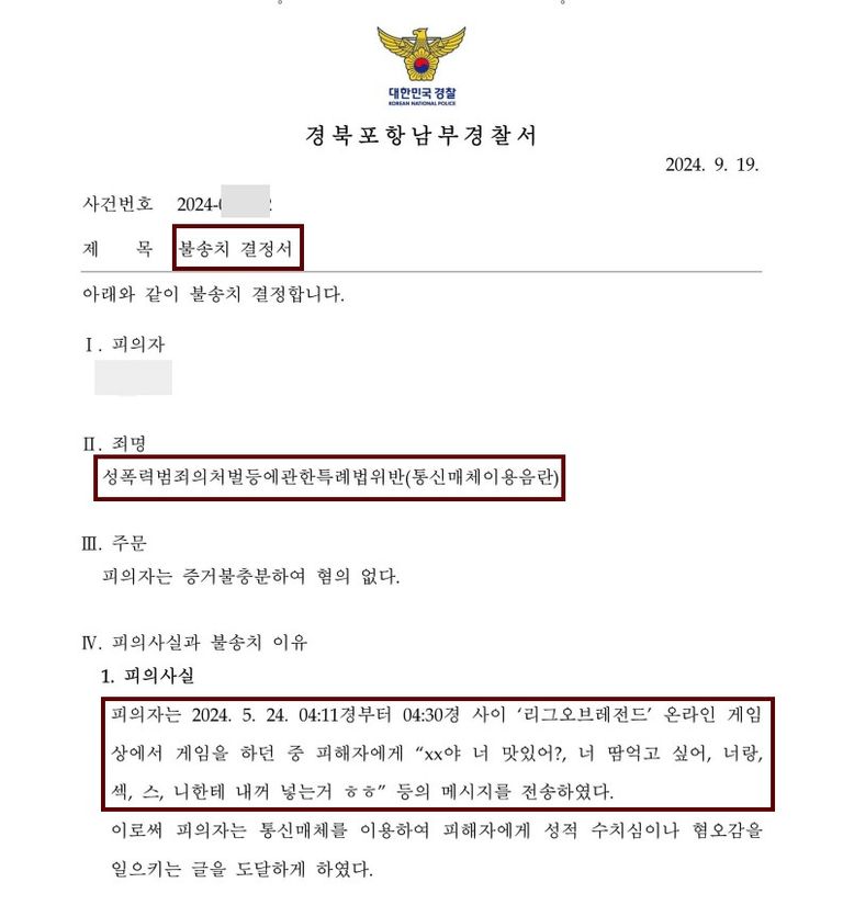 누군가는 이제 게임 통매음은 무조건 불송치라고 이야기하는데, 실제 현업에서는 법리를 제대로 이해하지 못한 수사관이 사건을 송치하는 경우가 꽤 있습니다. 검사는 송치 의견으로 온 사건은 깊이 들여다보지 않거나 형사 조정에 회부하는 경우가 많기 때문에 끝까지 신경쓰지 않는다면 충분히 무혐의를 받을 수 있는 사건도 벌금형을 받게 될 수 있다는 점을 참고하시고 반드시 주의하셔야 합니다.