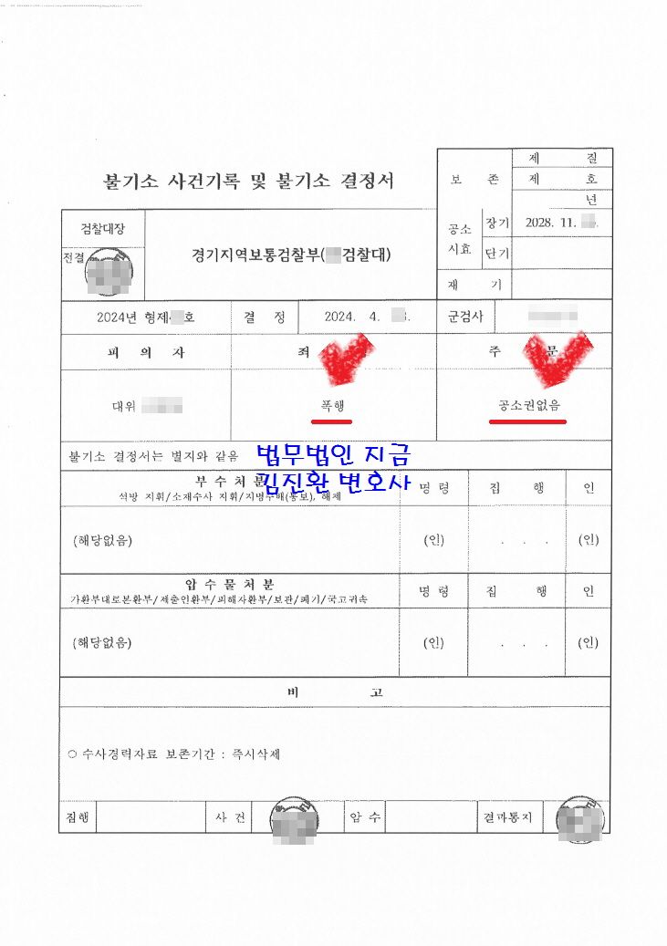 군검사님은 이러한 변호인의 주장을 받아들여서 군사경찰에서 상해죄로 송치되었음에도 수사 과정에서 죄명을 '폭행죄'로 변경하였고 고소인으로부터 피고소인의 처벌을 원하지 않는다는 의사가 접수되자 '공소권없음' 처분을 내렸습니다.