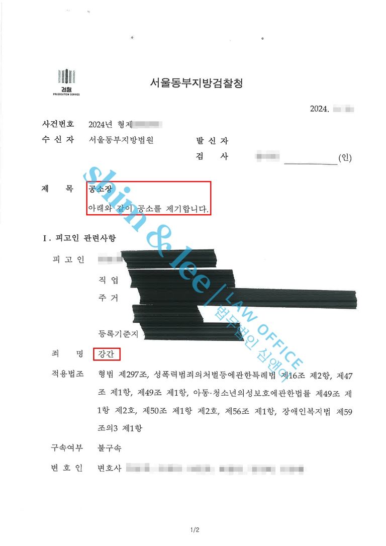 - 피해자는 강간 피해 이후 2차 피해를 입게 될까 두려움에 떨고 있다는 점, 거절했음에도 무자비한 폭력으로 강간한 점을 강력하게 피력하여 피해자 변호사 의견서와 엄벌탄원서를 제출하였습니다.