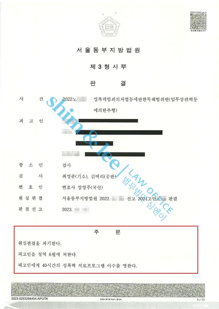 - 그 결과 2심 재판부는 피해자의 손을 들어주었습니다. 업무상 위력 등에 의한 추행으로 이례적으로 징역 6월이 선고되어 법정 구속되었을 뿐 아니라, 성폭력 치료 강의 40시간 및 취업제한 3년이라는 부가 처분까지 내려졌습니다.