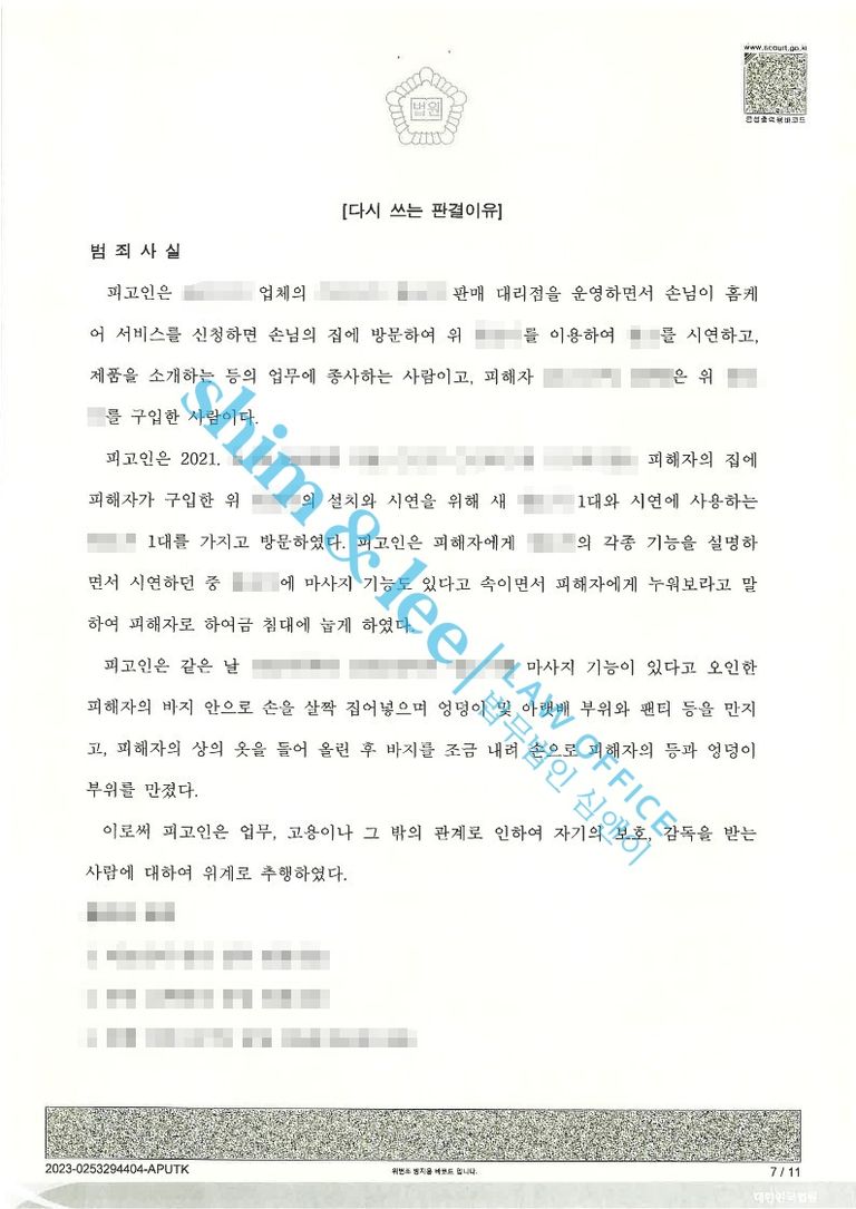 - 사건 이후 인터넷 검색을 통해 가해자가 시연해 보였던 그 가전제품에는 마사지 기능이 없는 것을 알게 되었습니다. 피해자는 사건 이후 수치심과 불쾌함으로부터 벗어날 수 없었으며, 가해자가 피해자의 집 주소, 전화번호 등을 알고 있었기에 또다시 찾아올 수도 있다는 불안감에 행위에 대한 마땅한 처벌을 원해 심앤이를 찾아주셨습니다.