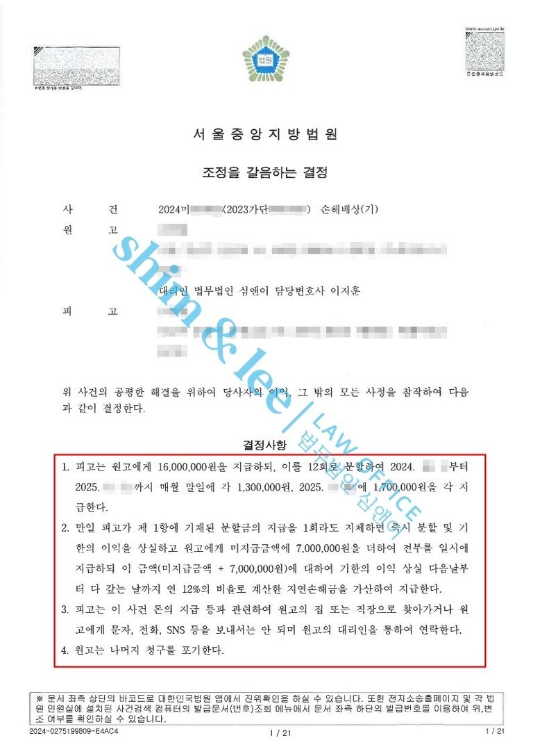 - 민사에서도 단순 추행에 평균적으로 인용되는 액수보다 훨씬 높은 1,600만 원을 배상하라는 강제조정 결정이 내려졌습니다. 의뢰인님께선 변호사 선임 비용 등 비용적인 부분에서 부담을 덜게 되었다며 기뻐하셨습니다.