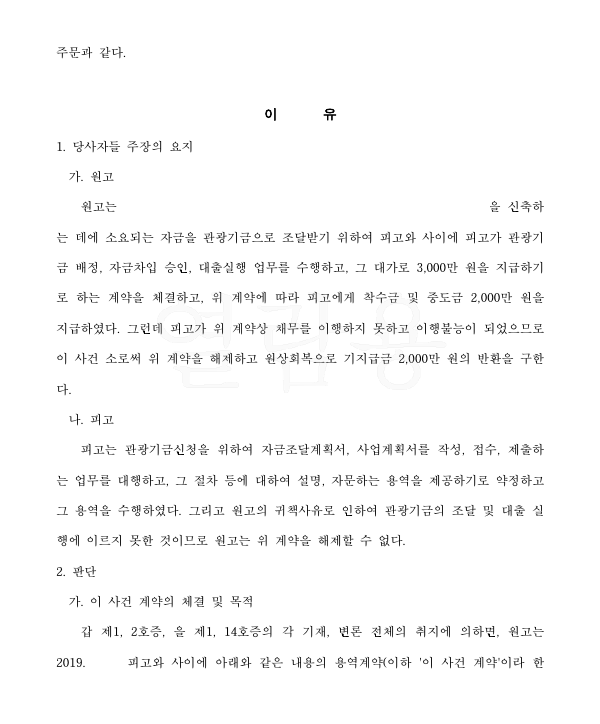 의뢰인은 피고와 용역계약을 체결하였는데 그 내용은 원고가 신축하는 건물의 신축 자금에 관하여 피고가 대출이 실행될 수 있게 하는 것이었습니다. 그런데 피고는 원고로부터 용역대금을 받았으나 대출이 전혀 실행되지 아니하였고 피고는 대금 반환을 거부하여 의뢰인은 저를 찾아오셨습니다.