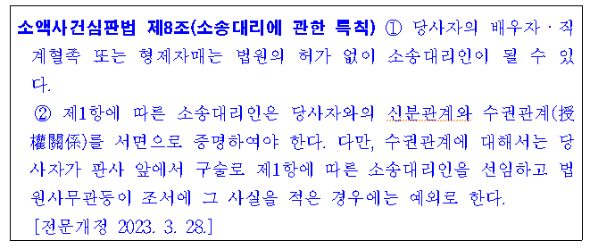 그런데 소액사건의 경우 당사자의 배우자, 직계가족, 형제자매는 이를 증명하여 변론기일에 대리 출석이 가능합니다.