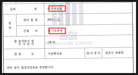 저는 의뢰인이 어떠한 형사처벌도 받은 적이 없는 초범으로 사건 이후 피해자가 "나한테 할 말 없냐"고 물었을 때 자신의 잘못을 진지하게 사과하면서 피해자가 원한다면 회사를 그만두겠다는 의사를 밝혔고, 피해자는 진심 어린 사과를 받아들였으며 형사조정에서 위 두 건의 주거침입과 관련하여 피해보상금 900만 원을 받고 합의를 하였다는 점, 평소 성실한 근무태도를 보인 피해자를 위해 회사 동료와 친구들이 선처를 탄원하고 있는 점을 들어 의뢰인에게 최대한 관대한 처분을 내려주길 바라는 변호인 의견서를 반성문과 함께 검찰에 제출하였습니다.