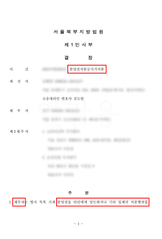 이에 김도헌 변호사는, 빠르게 분양권 상태의 권리를 가처분신청하였고, 법원은 의뢰인의 주장을 인정하여 분양권에 대한 가처분을 인용하는 판결을 하였습니다.