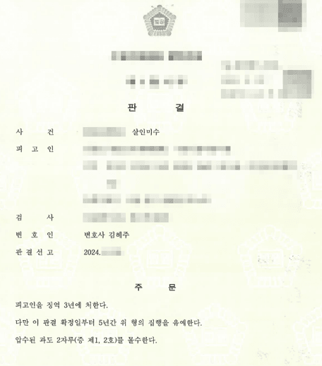 이러한 노력의 결과, 피고인은 1심에서 법리적으로 미필적 고의를 부정하기 어려운 상황이어서 살인미수가 인정되었음에도, 집행유예 판결을 받고 석방되었습니다.