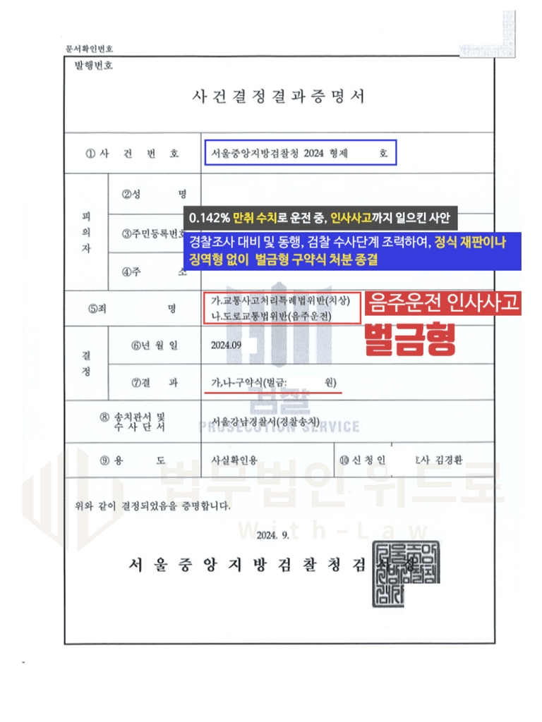 그 결과로, 본 사안은 일반변호사의 조력이었다면 징역형의 집행유예 또는 실형을 선고받았을 건데, 음주운전전문변호사 조력을 받아 벌금형으로 종결되었습니다.