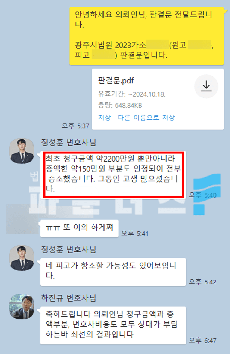 그 결과 법원은 변호인의 주장을 받아들여 약정금액 돈 지급 및 소송 피용 피고(A 씨) 부담의 판결을 내려 승소의 결과로 마무리 지을 수 있었습니다.