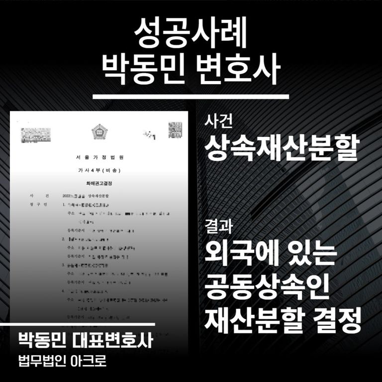그러나 외국에 있는 공동상속인들과 상속재산분할 협의를 하기 어려운 상황이었던 만큼, 의뢰인은 “법무법인 아크로, 상속 전문 박동민 변호사”를 찾아와 법적인 조력을 요청하였습니다.