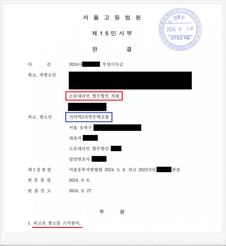 그러나 이와 같은 법원의 판결에도 피고 거여역2지역주택조합 측은 패소를 인정하지 못하고, 항소하였습니다.