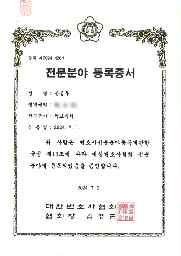 대한변호사협회 정식 등록 학교폭력전문변호사 신정우