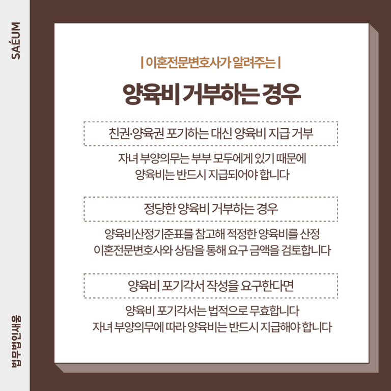 만약 양육비 포기각서를 작성하라는 요구를 받았다면, 그 각서는 법적으로 무효입니다. 자녀 부양의무는 부부 모두에게 있기 때문에, 양육비는 반드시 지급되어야 합니다.
