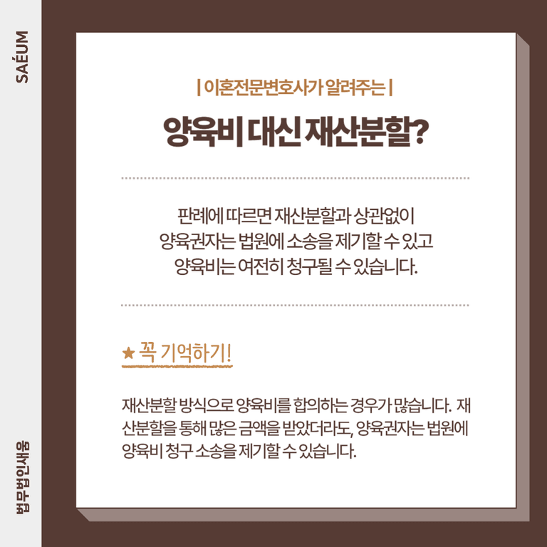 일부는 매월 양육비를 지급하는 대신 재산분할로 대체할 수 있는지 궁금해하기도 합니다. 그러나 재산분할 방식으로 양육비를 합의했다 하더라도, 법적 의무는 사라지지 않습니다.