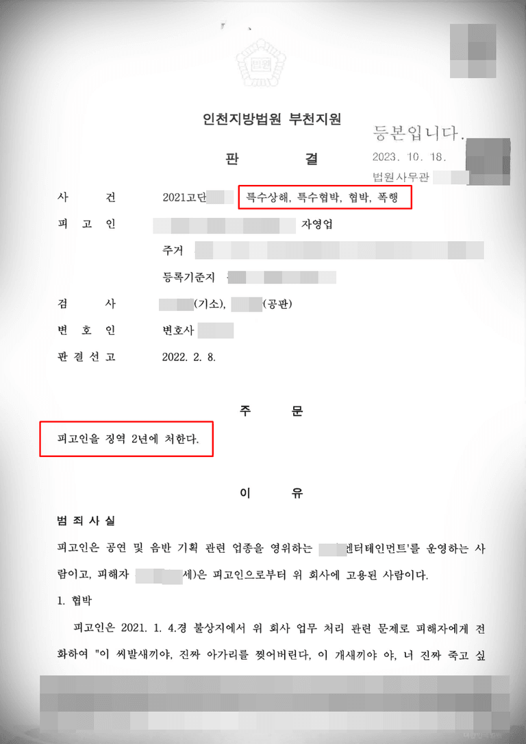 본 사건은 형사 사건 피고인을 변호한 사건이 아닌, 피해자의 형사 고소와 변호인 조력을 담당한 사건입니다. 본 사건 의뢰인께선 모 연예 기획사에서 재직하던 중 해당 회사의 대표로부터 상습적인 폭행과 특수 협박 및 협박, 상해 및 특수 상해 등의 범죄 피해를 당하였습니다.