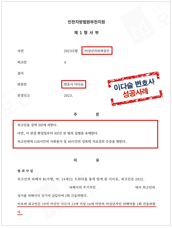 본 사건은 형사전문변호사인 이다슬 변호사가 피고인의 변호인으로 선임되어 피고인의 선처를 위해 조력하였습니다. 무엇보다 법정형이 강간죄와 동일하기 때문에 실형을 피하기 위해서는 집행유예를 받아야 하는 상황이었습니다.