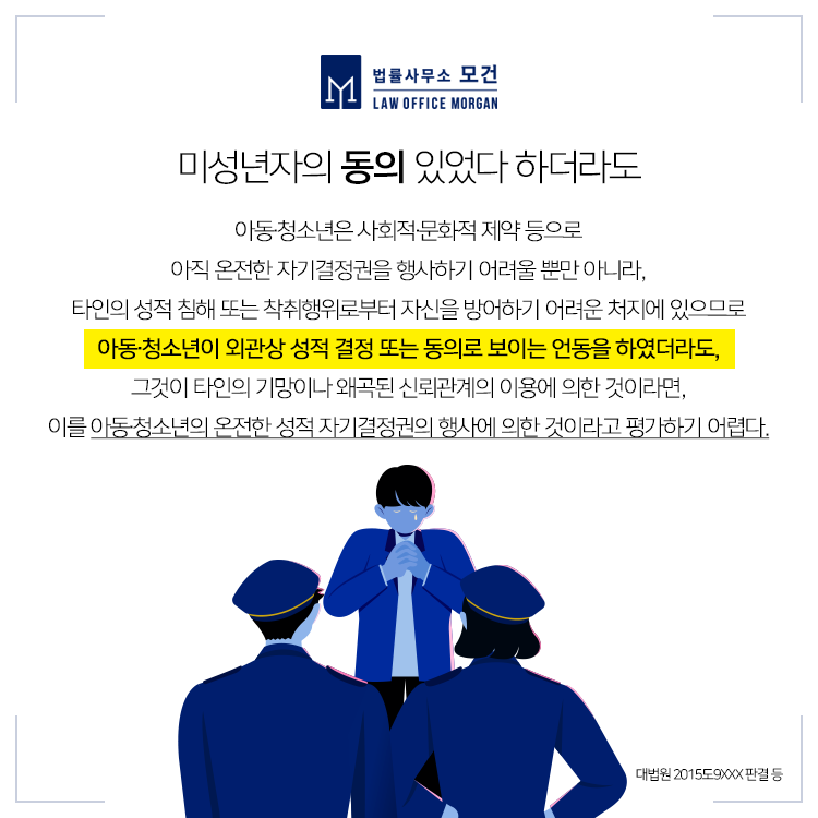 우리 사회는 미성년자가 피해자가 되는 여러 성범죄가 문제가 되면서 이와 관련한 처벌기준이 매우 상향되었고, 아동·청소년의 보호를 위해 관련 범죄자들을 매우 무겁게 처벌하고 있는 실정입니다.