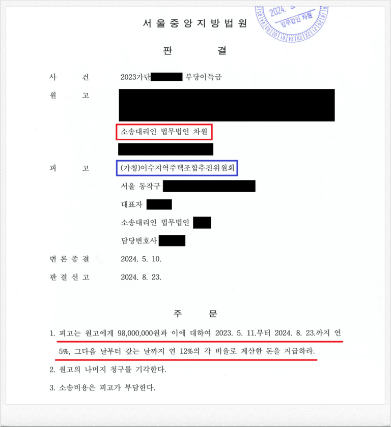 결국, 재판부는 이러한 저의 주장을 받아들였고, 피고는 의뢰인에게 98,000,000원 및 이에 대한 지연손해금을 지급하라는 내용의 판결을 이끌어 내었습니다.