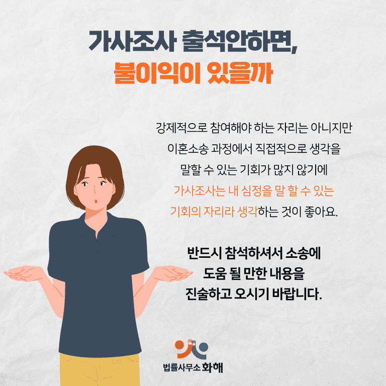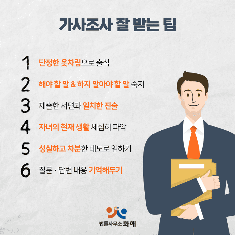 오늘 법률사무소 화해가 알려드릴 ‘가사 조사 참석 팁’을 잘 숙지하시고 가시면 문제 없습니다!