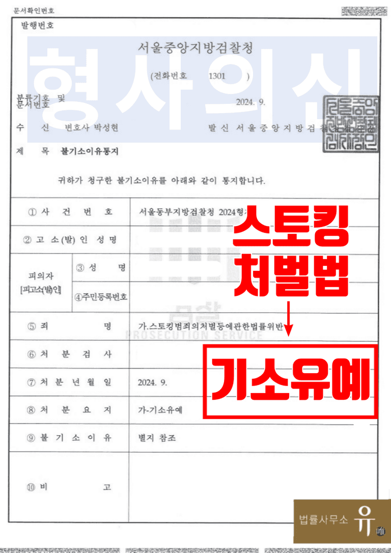 서울동부지방검찰청 검사는 법률사무소 유(唯)의 형사전문변호사의 주장 및 제출한 양형사유를 받아들여, 범행 사실은 인정되나, 의뢰인이 형사처벌을 받은 전력이 없는 초범인 점, 피해자가 합의에 응해 처벌을 원하지 아니한다는 의사를 표한 점, 의뢰인이 재범하지 않을 것을 다짐하는 등을 이유로 ‘기소유예’처분을 하였습니다.