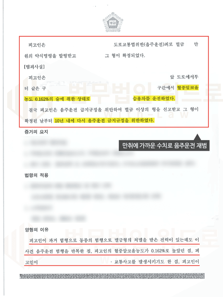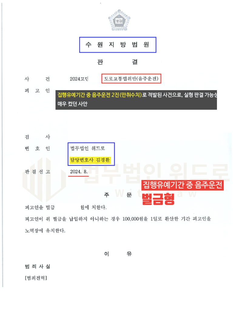 이후 재판에 김경환 검사출신변호사가 직접 참석하여, 의뢰인의 여러 사정을 변론하였습니다. 그 결과 재판부는 집행유예기간 중 음주운전이라는 점, 음주운전 2번 재범이라는 점, 음주 수치가 매우 높다는 점에서 엄벌해야 할 사안이지만, 담당 변호인의 변론을 참작하여 선처하였다며 벌금형 판결을 하였습니다.