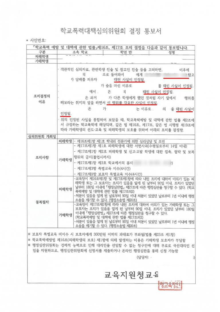이번 사건에서는 의뢰인이 받은 처분이 생기부에 기재되지 않는 3호 처분에 그쳤다는 점이 주목할 만합니다. 이번 사례는 학교폭력 사건에서 정확한 대응과 변호 전략이 얼마나 중요한지 보여주는 좋은 예라고 할 수 있습니다.