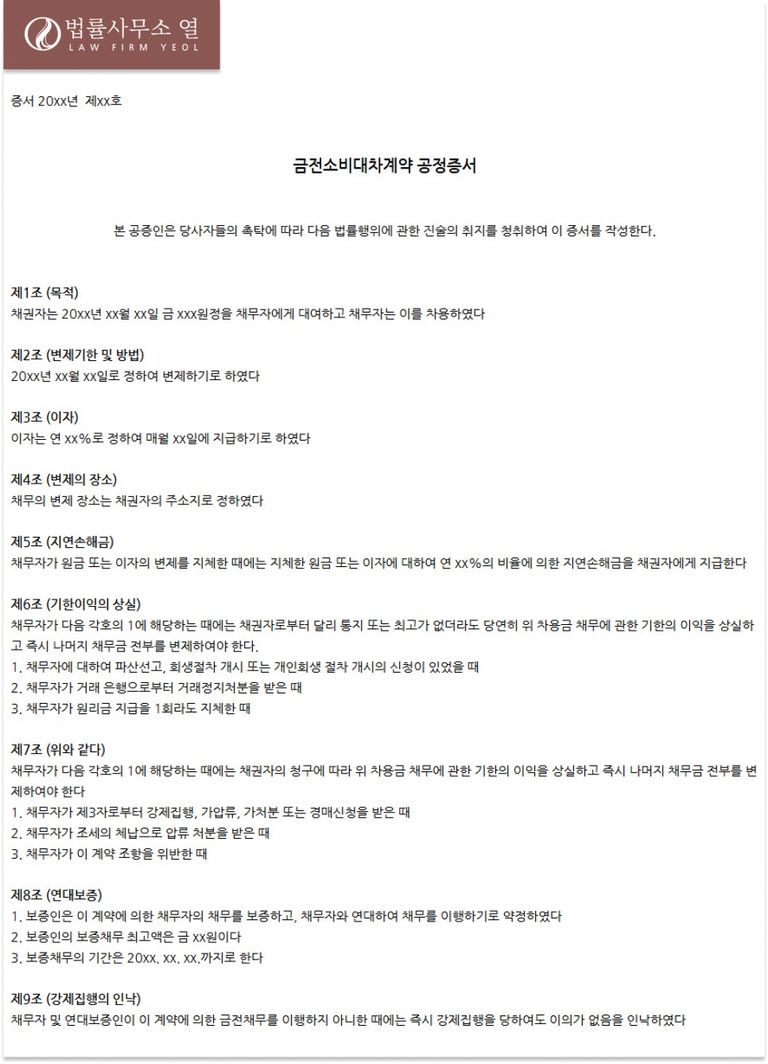이외에도 공증받은 차용증은 민·형사재판에서 강력한 증거력을 갖게 됩니다. 따라서 분쟁을 미연에 예방하거나 분쟁이 발생한 경우 이를 효율적으로 해결할 수 있습니다.