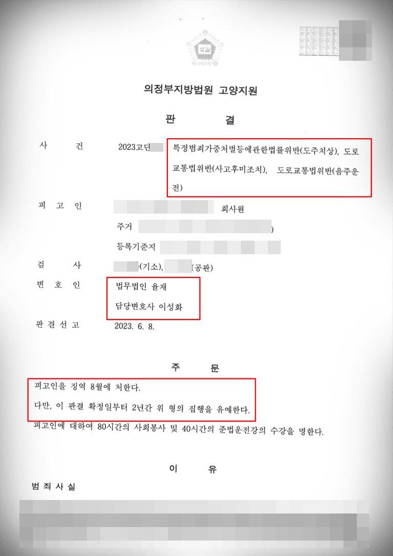 본 사건은 음주운전 3진아웃에 더하여 피해자에게 상해를 입히고 그대로 도주하여 음주 뺑소니에 해당하는 심각한 사안이라고 할 수 있습니다. 이런 경우 징역형 실형이 선고되는 비중이 날이 갈수록 늘어나고 있기에 저희 율재 소속 모든 변호사들이 힘을 합쳐 적극적으로 변호한 사건이기도 하고요.