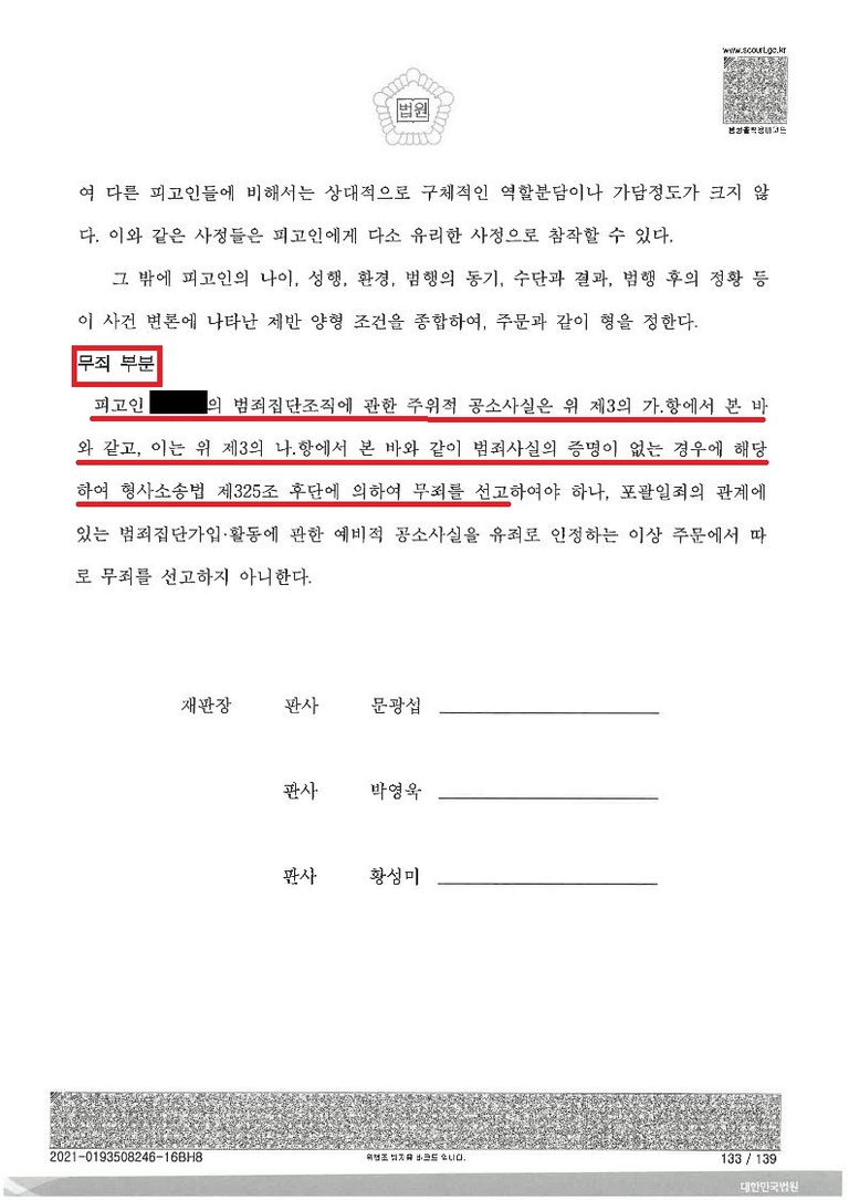 1심 법원은 검찰의 공소장 그대로 판결을 하였고 의뢰인은 모든 혐의가 인정되어 징역 15년이 선고되었습니다. 2심에서 공범들과 수사기관에 대한 증인신문을 통하여 범죄단체조직죄가 무죄임을 입증하였습니다.