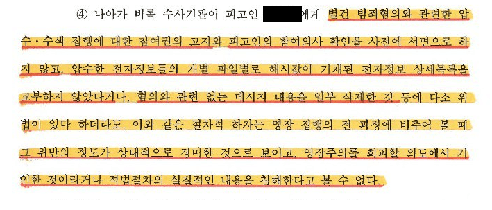 아쉬운 점은 압수수색에 있어 수사기관이 ① 참여권을 고지하지 않고(당연히 참여의사를 확인하지도 않았을 뿐더러), ② 압수수색한 파일의 목록을 교부하지 않고, ③ 혐의와 관련 없는 (그러나 무죄를 입증할 수 있는) 메시지 내용을 삭제한 것을 법원이 인정하게 하였지만 이를 토대로 무죄를 이끌어내지는 못했다는 점입니다.