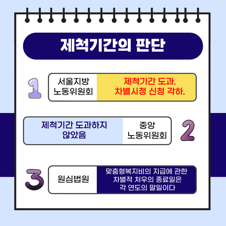 이에 서울지노위는 맞춤형복지비에 관해 제척기간이 도과했다는 이유로 차별시정 신청을 각하했으나, 중앙노동위원회는 초심판정과 달리 맞춤형복지비에 관한 제척기간이 도과되지 않았다고 판단하고 지방자치단체인 원고에게 맞춤형복지비 지급을 명하였습니다.