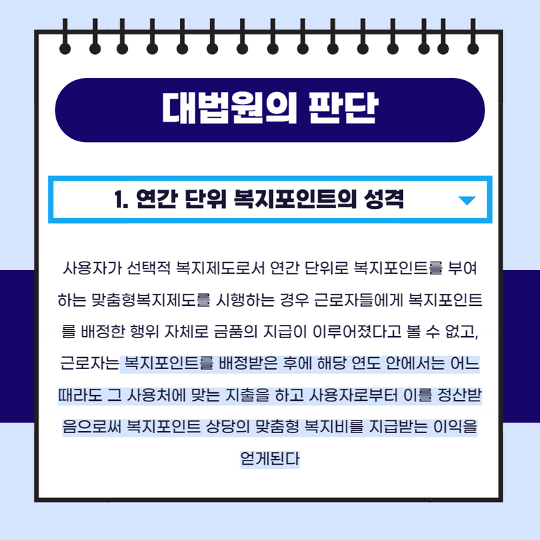 사용자가 선택적 복지제도로서 연간 단위로 복지포인트를 부여하는 맞춤형복지제도를 시행하는 경우 근로자들에게 복지포인트를 배정한 행위 자체로 금품의 지급이 이루어졌다고 볼 수 없고(대법원 2019. 8. 22. 선고 2016다48785 전원합의체 판결 참조), 근로자는 복지포인트를 배정받은 후에 해당 연도 안에서는 어느 때라도 그 사용처에 맞는 지출을 하고 사용자로부터 이를 정산받음으로써 복지포인트 상당의 맞춤형 복지비를 지급받는 이익을 얻게 됩니다.