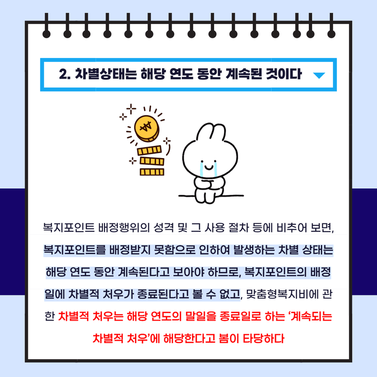 복지포인트 배정행위의 성격 및 그 사용 절차 등에 비추어 보면, 복지포인트를 배정받지 못함으로 인하여 발생하는 차별 상태는 해당 연도 동안 계속된다고 보아야 하므로, 복지포인트의 배정일에 차별적 처우가 종료된다고 볼 수 없고, 맞춤형복지비에 관한 차별적 처우는 해당 연도의 말일을 종료일로 하는 ‘계속되는 차별적 처우’에 해당한다고 봄이 타당하다고 판시하였습니다.