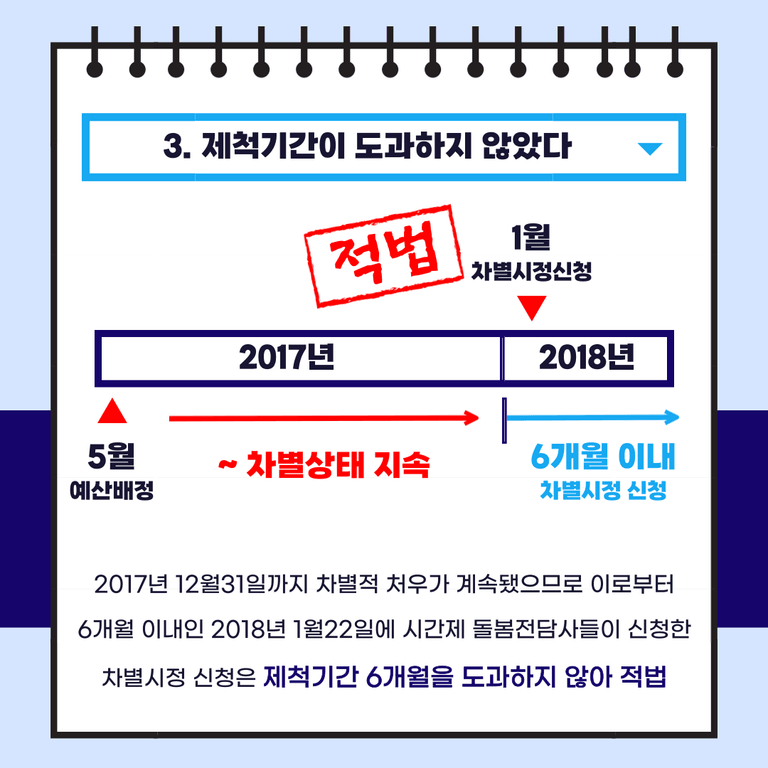 2017년 12월 31일까지 차별적 처우가 계속됐으므로 이로부터 6개월 이내인 2018년 1월22일에 시간제 돌봄전담사들이 신청한 차별시정 신청은 제척기간 6개월을 도과하지 않아 적법한 신청이라고 보았습니다.