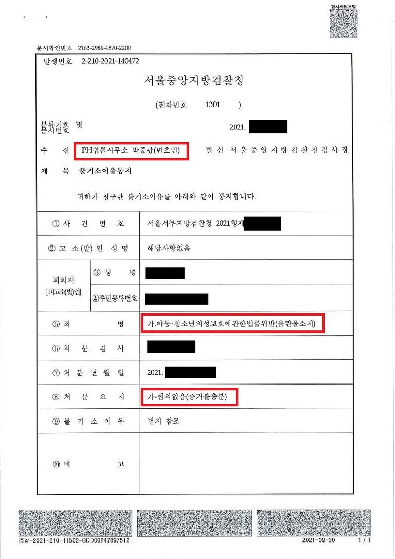 변호사는 사건을 검토하며 위법하게 자백을 받아낸 점을 발견하고 이후 조사에서 묵비권을 행사하였습니다. 사건은 혐의없음으로 종결되었습니다.