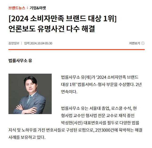 법률사무소 유(唯)가 ‘2024 소비자만족 브랜드 대상 1위’ 법률서비스-형사 부문을 수상했다. 2년 연속이다.