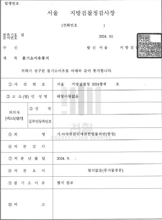 검찰은 변호인의 의견을 적극 수용하여 마약류관리에관한법률위반(향정) 향정신성의약품 매수, 매도, 투약죄에 대해 무혐의 처분을 내렸습니다.