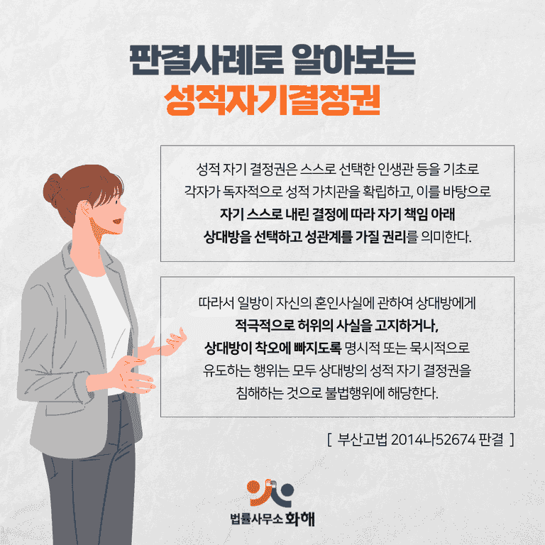 하지만 상대방이 나에게 제대로 된 정보가 아닌 허위 정보로 나를 속였다면? 이 결정권이 침해된 겁니다. 즉, 결혼한 사실을 속이고 성관계를 맺는 것은 불법행위에 해당 되며 여러분은 피해에 대한 적극적인 소송을 통해 보상을 받아낼 수 있게 됩니다.