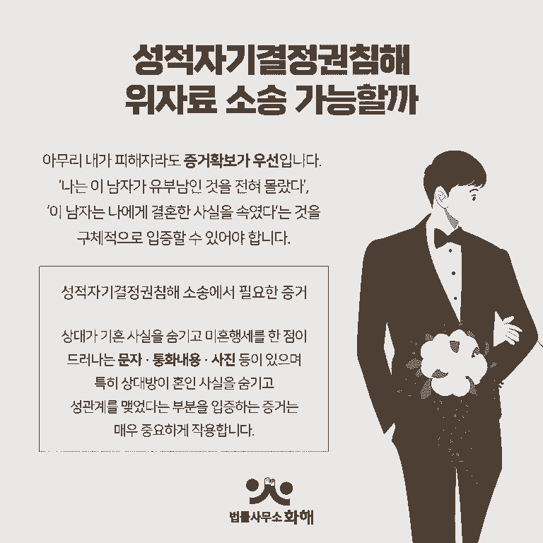 우선, 상대방이 혼인사실을 속이고 관계를 지속한 이 상황에서 여러분은 ‘성적자기결정권’을 침해당했고 이러한 불법행위로 인한 정신적 고통에 대해 손해배상을 청구할 수 있습니다.