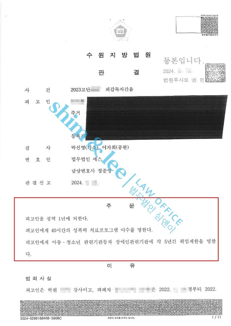 - 결국 업무 상의 위력으로 범행을 저질렀다는 것과, 피해자에게 2차 가해를 한 정황이 있다는 것이 인정되어 가해자에게는 징역 1년이 선고되어 법정 구속되었습니다. 뿐만 아니라, 성폭력 치료 강의 40시간과 가해자가 더 이상 학원에서 미성년자들을 가르칠 수 없도록 취업제한 5년이라는 매우 중한 부가 처분까지 내려졌습니다.