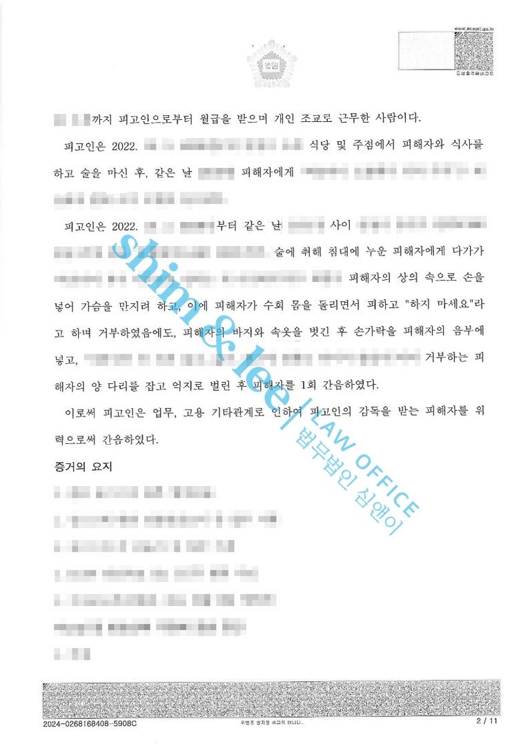 - 사건 이후에도 가해자는 학원을 그만두겠다는 피해자를 그만두지 못하게 하고, 지속적으로 연락을 시도하는 등 피해자를 2차 가해하였습니다. 피해자와 그 가족분들은 지휘 감독 관계를 악용하여 피해자에게 씻을 수 없는 피해를 준 가해자를 엄벌에 처벌해 주길 바라시며 성범죄 피해자를 전문으로 대리하는 심앤이를 찾아주셨습니다.