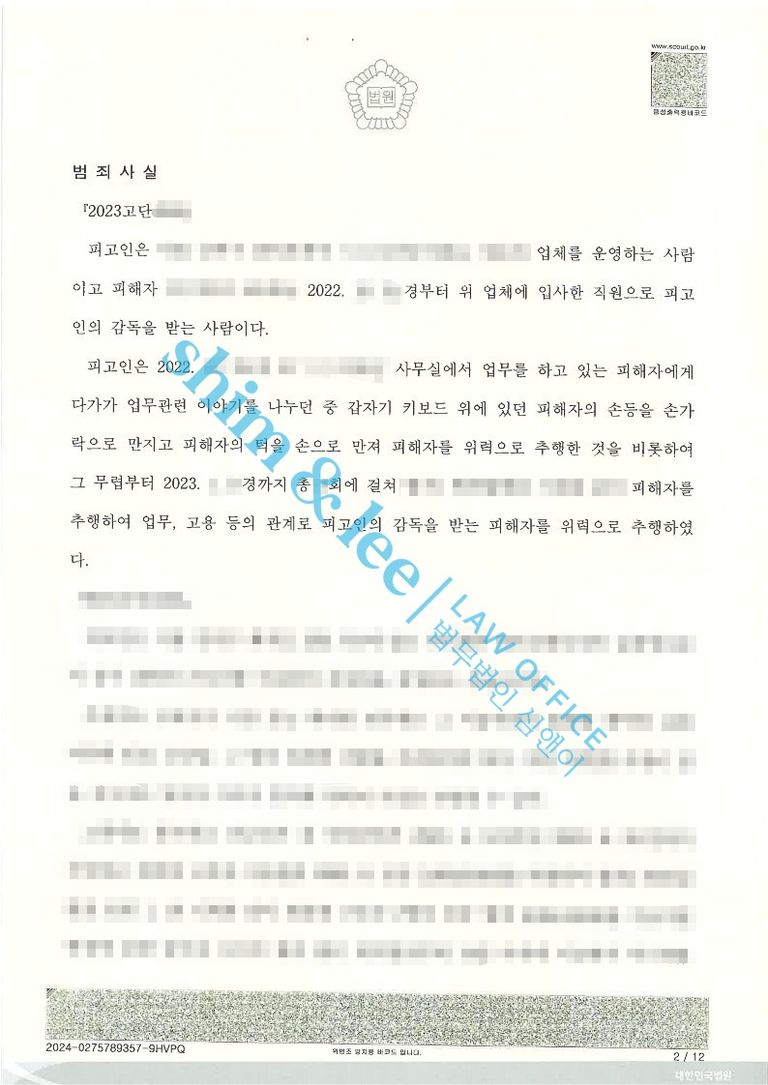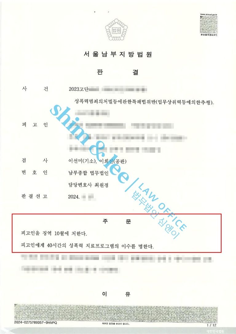 - 마침내 가해자가 업무, 고용 등의 관계로 피고인의 감독을 받는 피해자를 위력 추행한 것이 인정되어 징역 10월, 성폭력 치료 강의 40시간이라는 판결이 내려졌습니다.