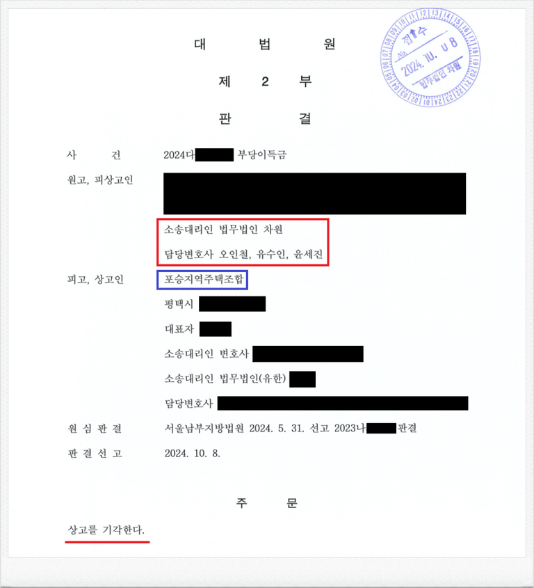 이번에도 재판부는 저의 주장을 받아들여, 피고 포승지역주택조합 측의 상고를 기각하였고, 결국 지역주택조합 분담금 반환 소송 대법원 최종 승소 판결을 이끌어 내었습니다.