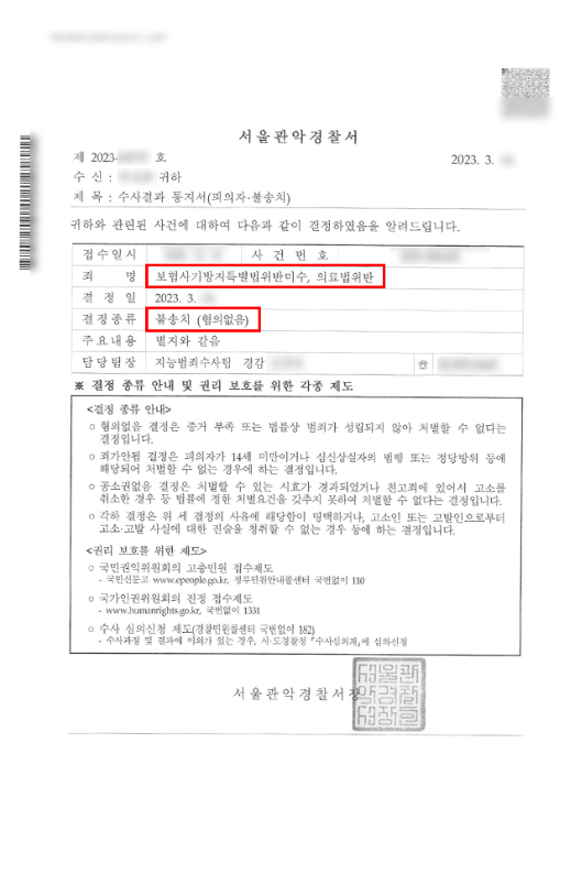결국, 관악경찰서는 한의사에게 고의가 없다는 취지로 무혐의 처분할 하게 되었습니다.