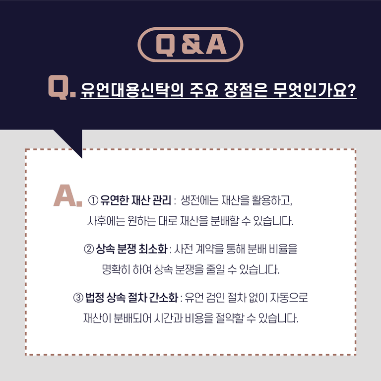 유언대용신탁은 법정 상속 절차를 단순화할 수 있습니다. 피상속인의 사망 후에도 수탁자(신탁회사가 될 수도 있음)가 재산을 관리하며, 수익자에게 신탁 재산을 분배합니다. 이를 통해 별도의 유언 검인 절차 없이 재산이 자동으로 분배되기 때문에 절차가 간소화되고 시간과 비용을 절약할 수 있습니다.