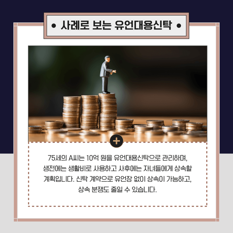 이를 통해 A씨는 유언장을 작성하지 않고도 신탁 계약을 통해 자신의 뜻을 반영한 재산 분배를 할 수 있습니다. 또한, 신탁사가 재산을 관리하므로 자녀들이 상속을 둘러싸고 분쟁을 벌일 가능성도 줄어듭니다.